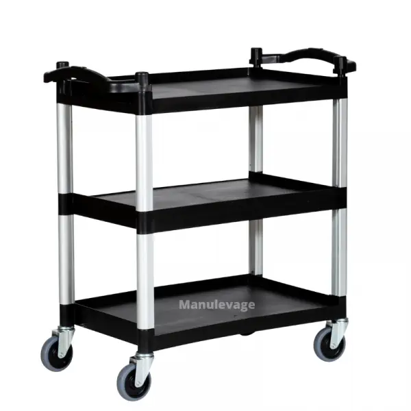 Ce chariot doté de 3 plateaux de couleur noire superposés en polypropylène est un précieux allié pour stocker et déplacer facilement des charges jusqu’à 250 kg.