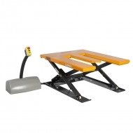 Pratique, notre table élévatrice électrique en E équipée d’un plateau extra plat de 82 mm , s'installe directement sur le sol pour accueillir la marchandise très facilement à l’aide d’un transpalette.